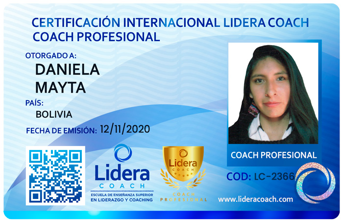 – COACHING PARA MUJERES con especialidad en Liderazgo, en fecha 12 de Noviembre de 2020 con número de certificado CPM-100-II-2020. Coach Femenino acreditada por ACF – Asociación de Coaching Femenino con código ACF-1196.