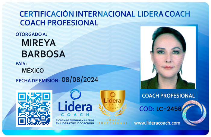 – COACH FEMENINO, WOMEN COACH, en fecha 08 de Agosto de 2024 con número de certificado LC-2456CF. Coach Femenino acreditada por ACF – Asociación de Coaching Femenino con código ACF-1239